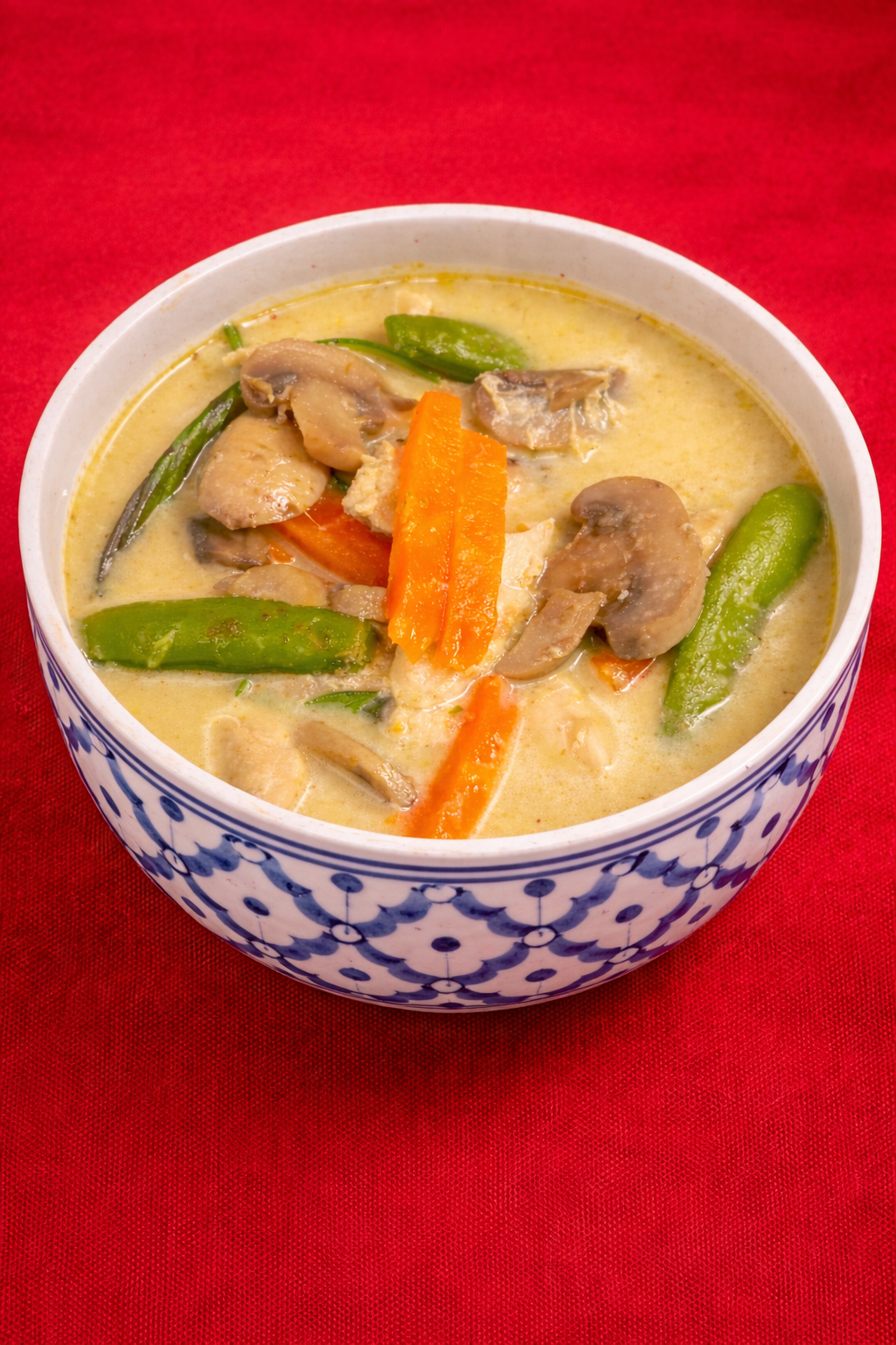 Fijn gesneden, gebakken kipfilet in zoete groene currypasta met sugarsnaps, cashewnoten en chamignons